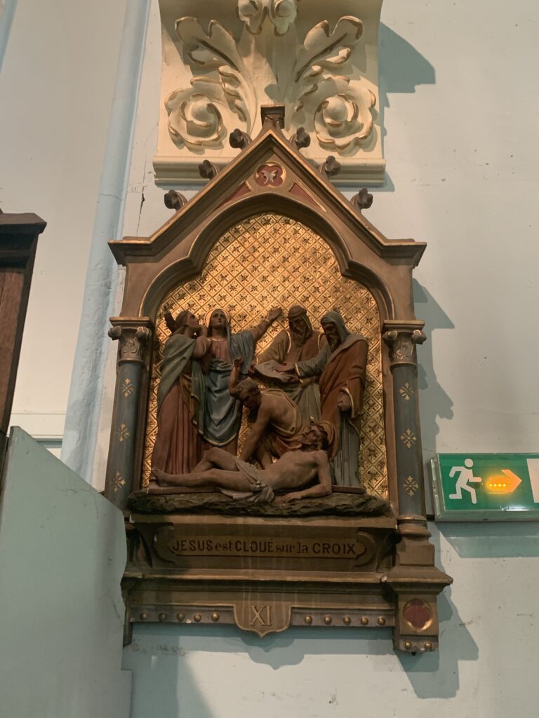 Lorsqu’ils furent arrivés au lieu-dit : Le Crâne (ou Calvaire), là ils crucifièrent Jésus, avec les deux malfaiteurs, l’un à droite et l’autre à gauche. Jésus disait : « Père, pardonne-leur : ils ne savent pas ce qu’ils font ».