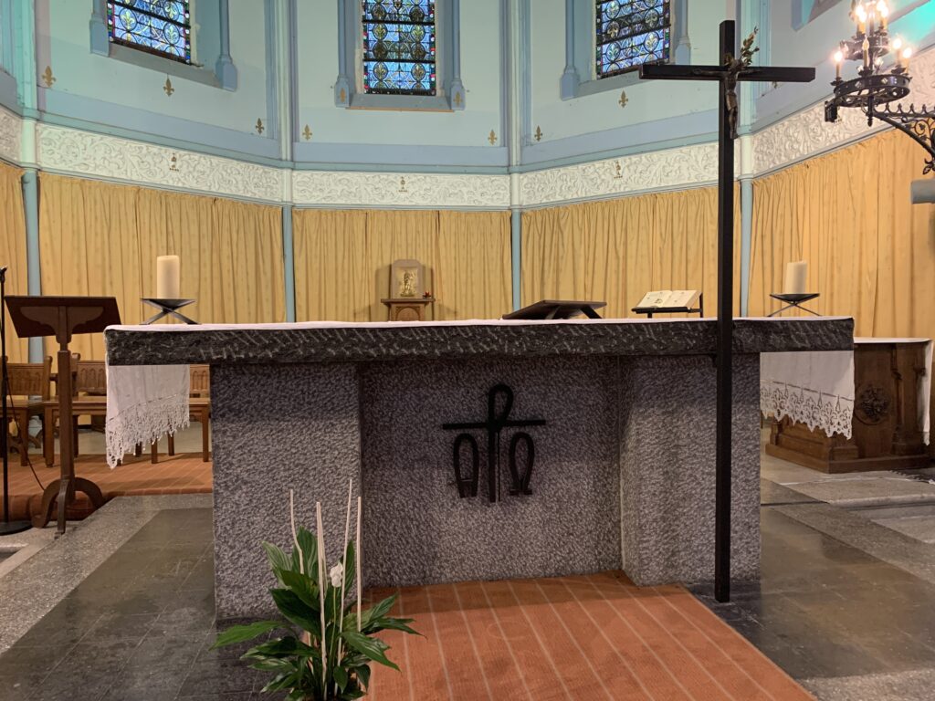 L’autel se situe dans le chœur de l’église. Il représente le tombeau de Jésus. C’est sur celui-ci que le prêtre ou l’évêque célèbre, au nom de Jésus, l’Eucharistie. Il rend présent et vivant Jésus dans le pain et le vin qui sont offerts. A chaque messe, par les mains du prêtre, le Christ offre sa vie. Il passe de la mort à la vie, il actualise sa victoire sur la mort et le péché. Jésus vivant nous sanctifie, nous unit, nous purifie, nous pardonne, nous ouvre un avenir.