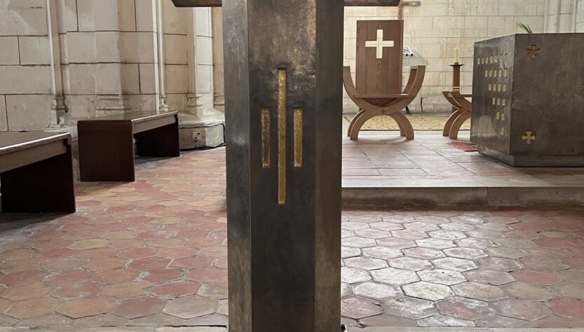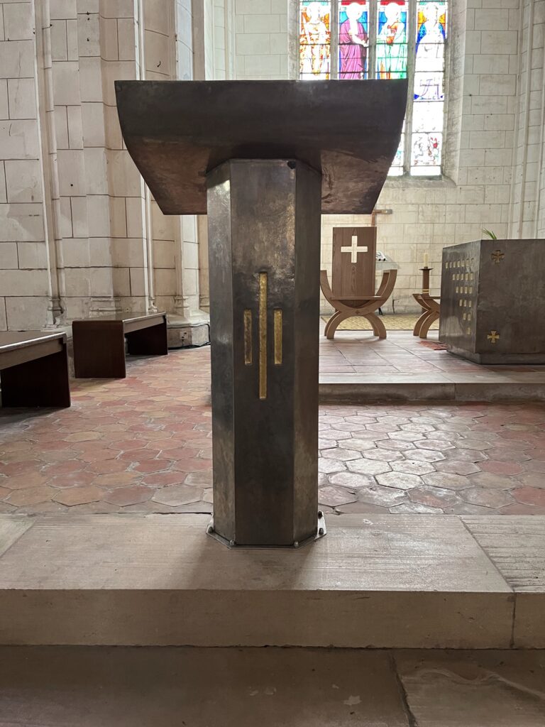 L’ambon est un pupitre fixe où est proclamée la Parole de Dieu. Dieu veut nous parler dans les Saintes Ecritures. L’écoute de la Parole de Dieu nous permet de rencontrer le Christ. Saint Jérôme qui a traduit la Bible en latin nous dit “Ignorer les Ecritures, c’est ignorer le Christ”. Pour écouter la parole de Dieu, il faut demander à l’Esprit-Saint de nous ouvrir les portes de notre cœur, et se rendre disponible par le silence à Dieu qui veut nous parler. “Parle ton serviteur écoute !” Sm 3,10. Après l’avoir écouté, et seulement après, nous pouvons lui apporter une réponse avec notre cœur mais aussi avec nos mains dans notre existence. A chaque fois que Dieu nous parle, il crée quelque chose de nouveau dans nos existences, sa parole agit en nous, elle nous éclaire, nous guide et nous transforme. Il est toujours bon de lire la Parole de Dieu avec d’autres afin de s’assurer que nous l’ayons bien comprise.