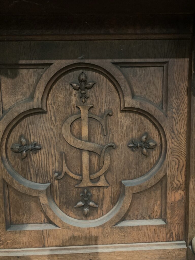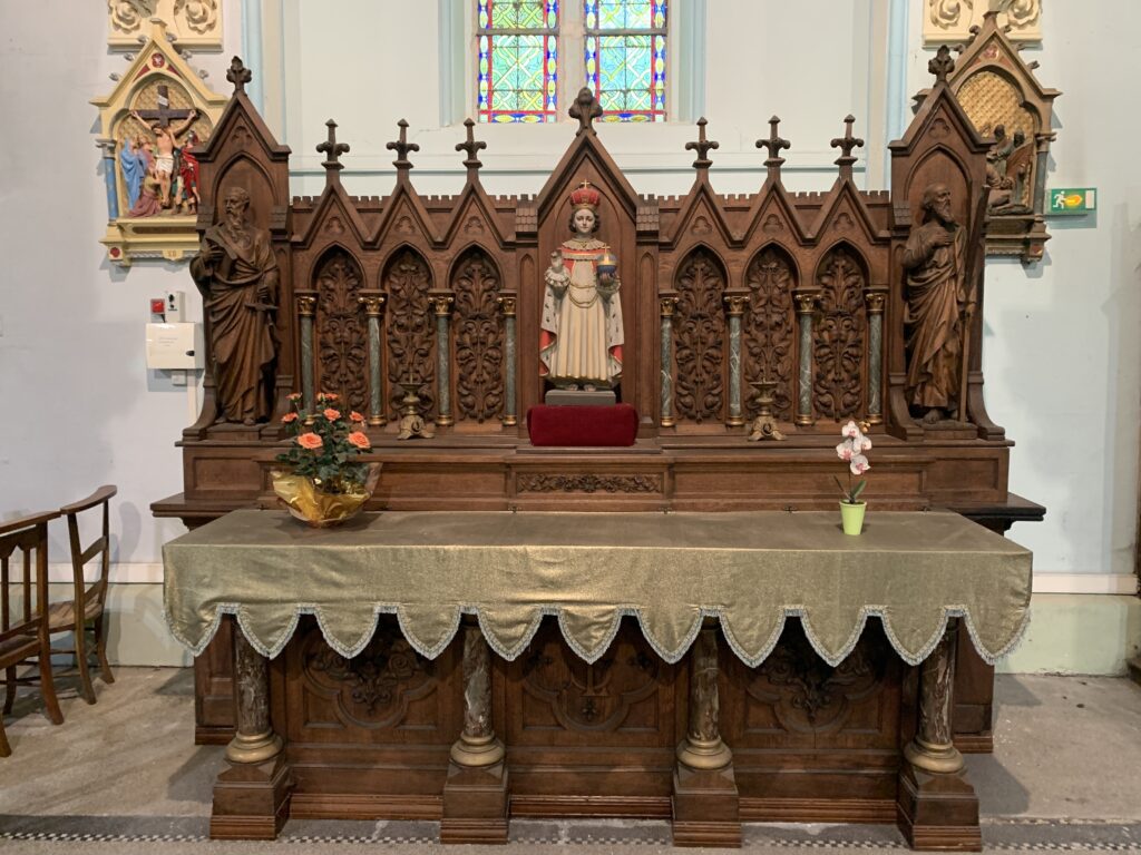 Cet autel est vraisemblablement l’ancien maître autel sur lequel était célébré la sainte messe avant le concile Vatican II, il devait être positionné dans le chœur de l’église. En effet, avant d’y voir reposer l’enfant Jésus de Prague, il était dédié à Saint Louis, patron de l’église. La sculpture SL dans le soubassement de l’autel est un précieux indice qui nous le rappelle.