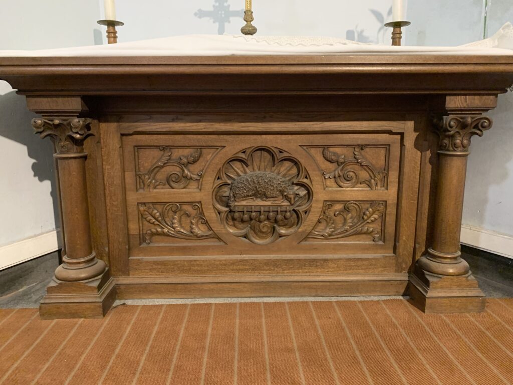 On voit sur cet autel, la sculpture d’un agneau offert en sacrifice sur une croix posée sur la parole de Dieu. L’agneau immolé est tel un soleil !