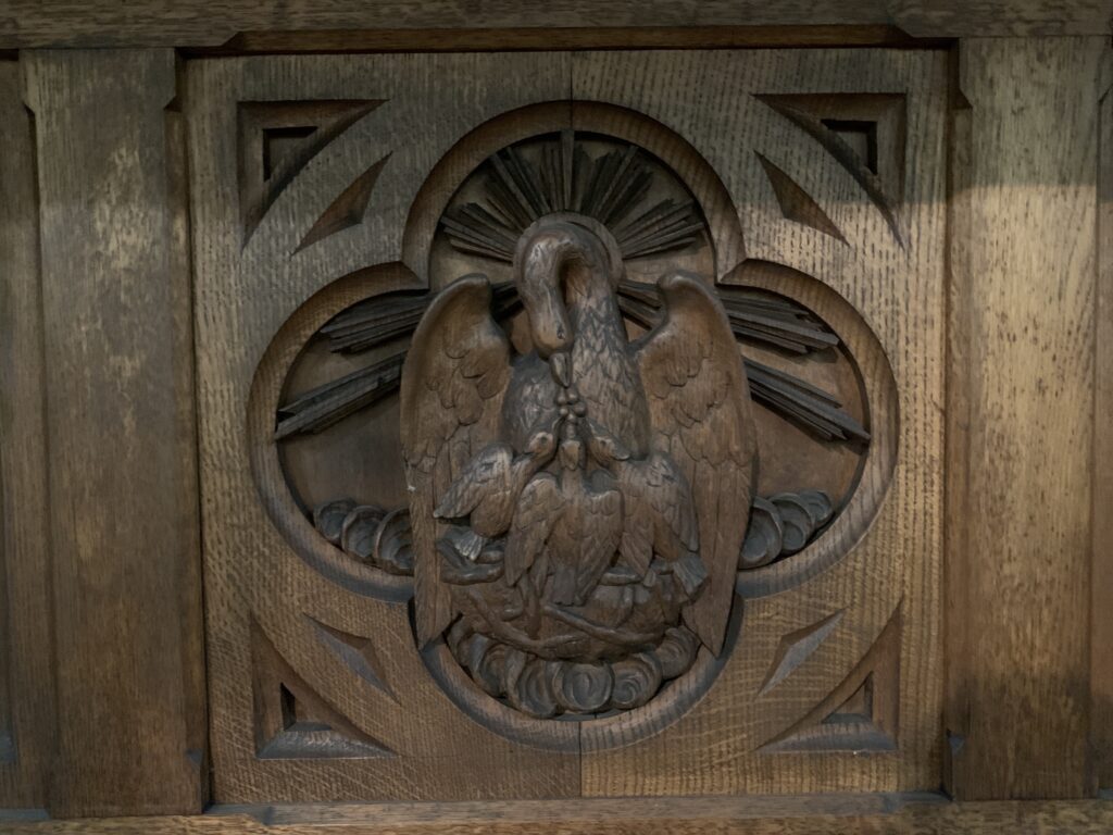 Sous l’autel, on peut apercevoir une sculpture d’un pélican donnant sa chair à manger à ses progénitures. C’est le symbole du Christ qui se donne en nourriture pour chacun de nous.