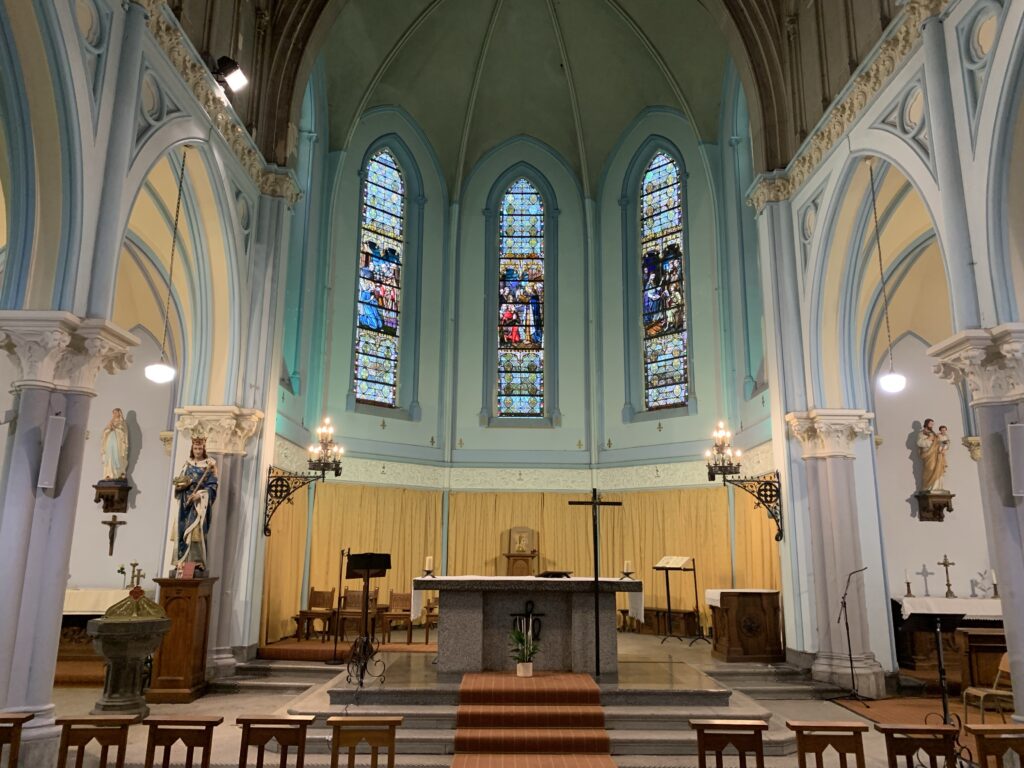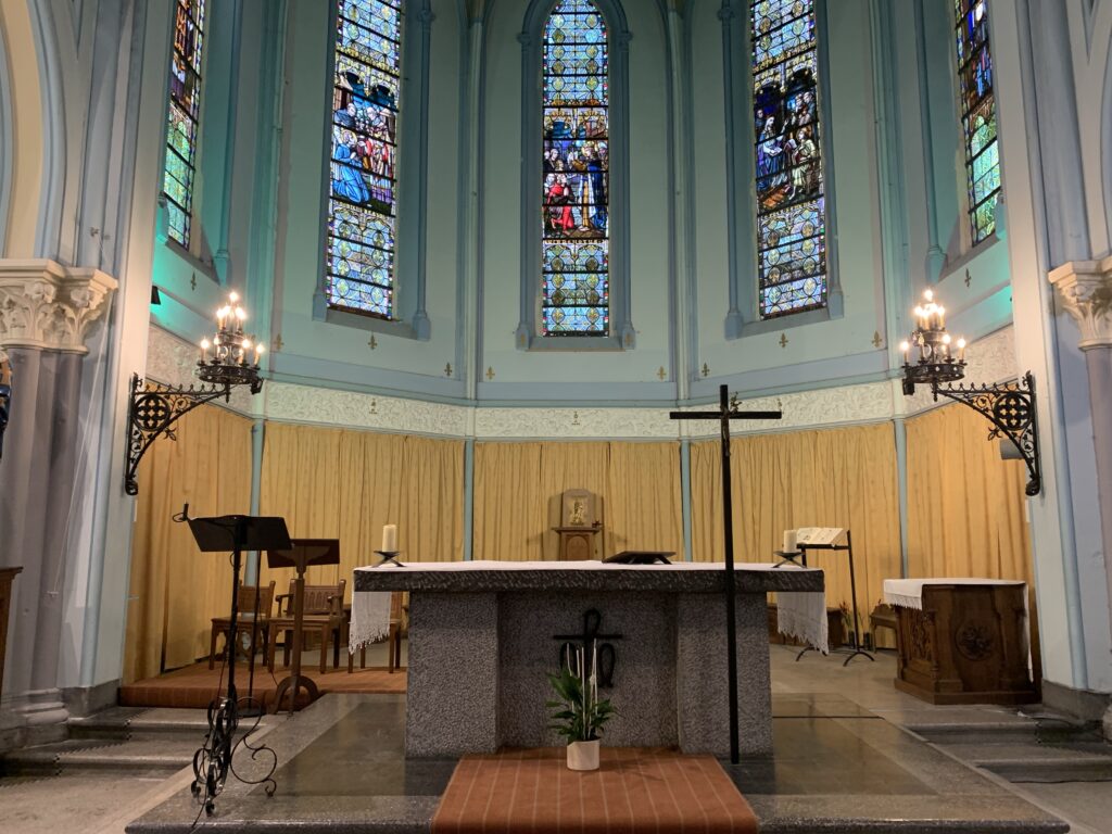 Dans le chœur de l’église, on trouve le tabernacle, l’Autel, le siège de présidence, le pupitre du célébrant, le pupitre de l’animateur, une crédence, les sièges des autres ministres l’ambon et des servants d’Autel.